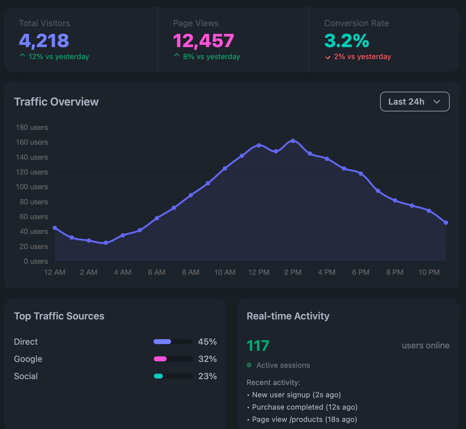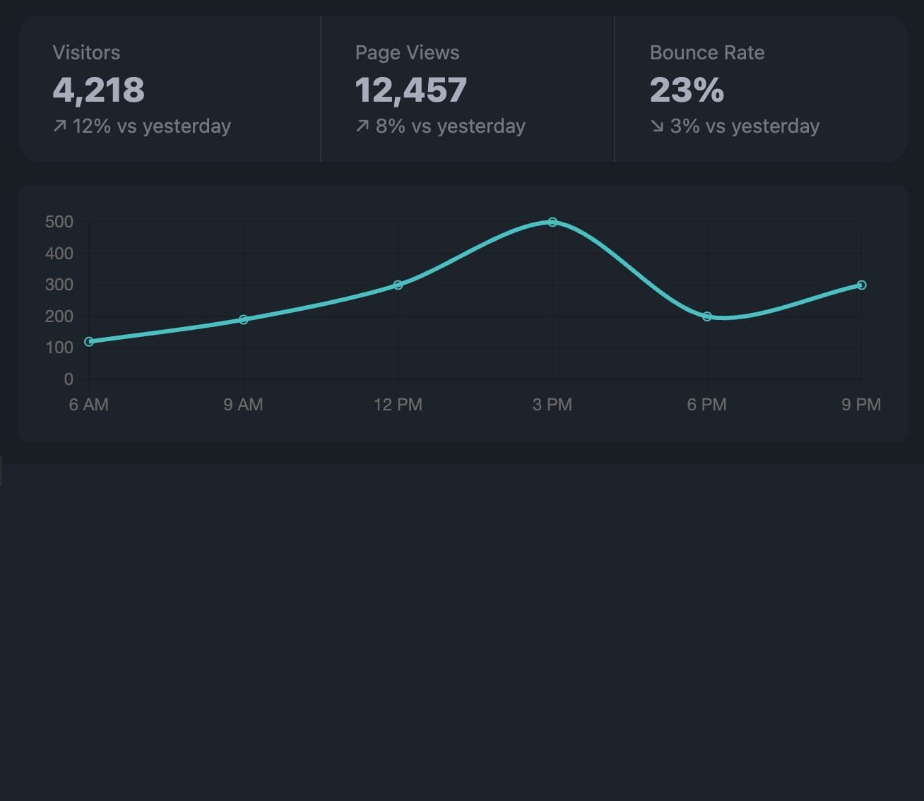 Dashboard showing Visitors: 4,218 (↗︎ 12% vs yesterday), plus a chart.