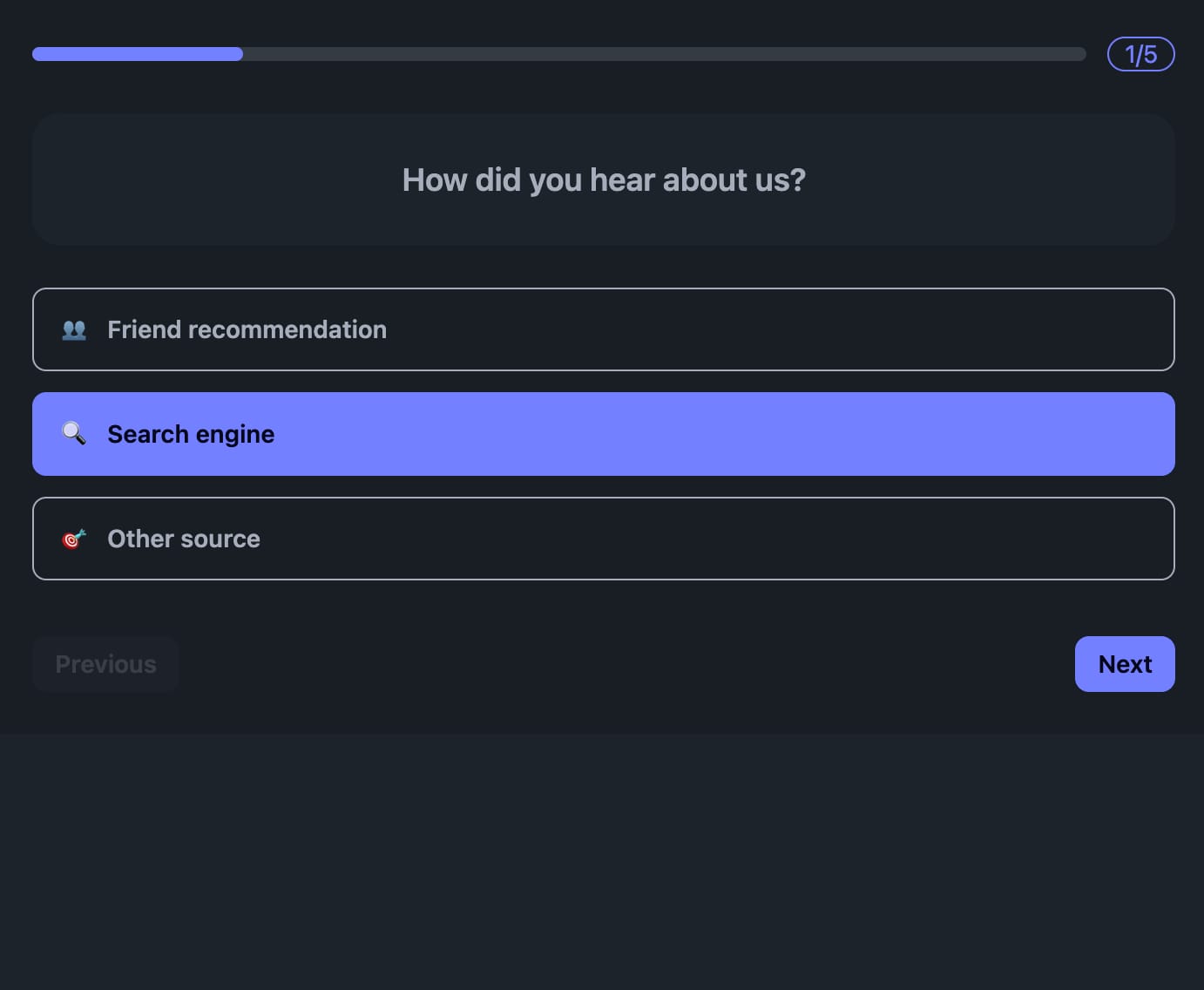 Survey window with progress bar (1/5), question: "How did you hear about us?", options [Friend recommendation 👥, Search engine 🔍, Other source 🎯], buttons [Previous (disabled), Next].
