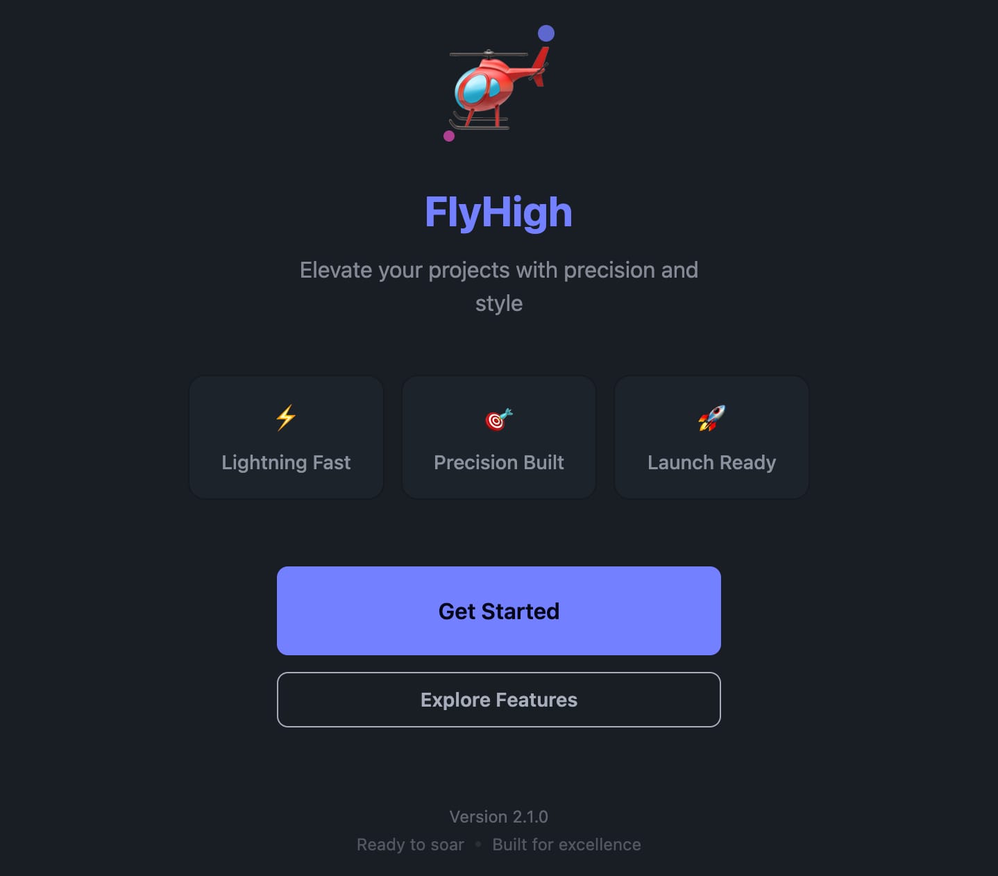 Welcome screen with title "FlyHigh", description, icons (⚡, 🎯, 🚀), buttons [Get Started, Explore Features], and version text.