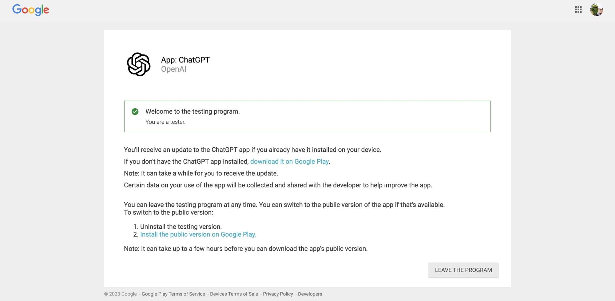 - Visit the Beta Program Link: Start by visiting the ChatGPT Beta program page on the Google Play Store. You can access it here.