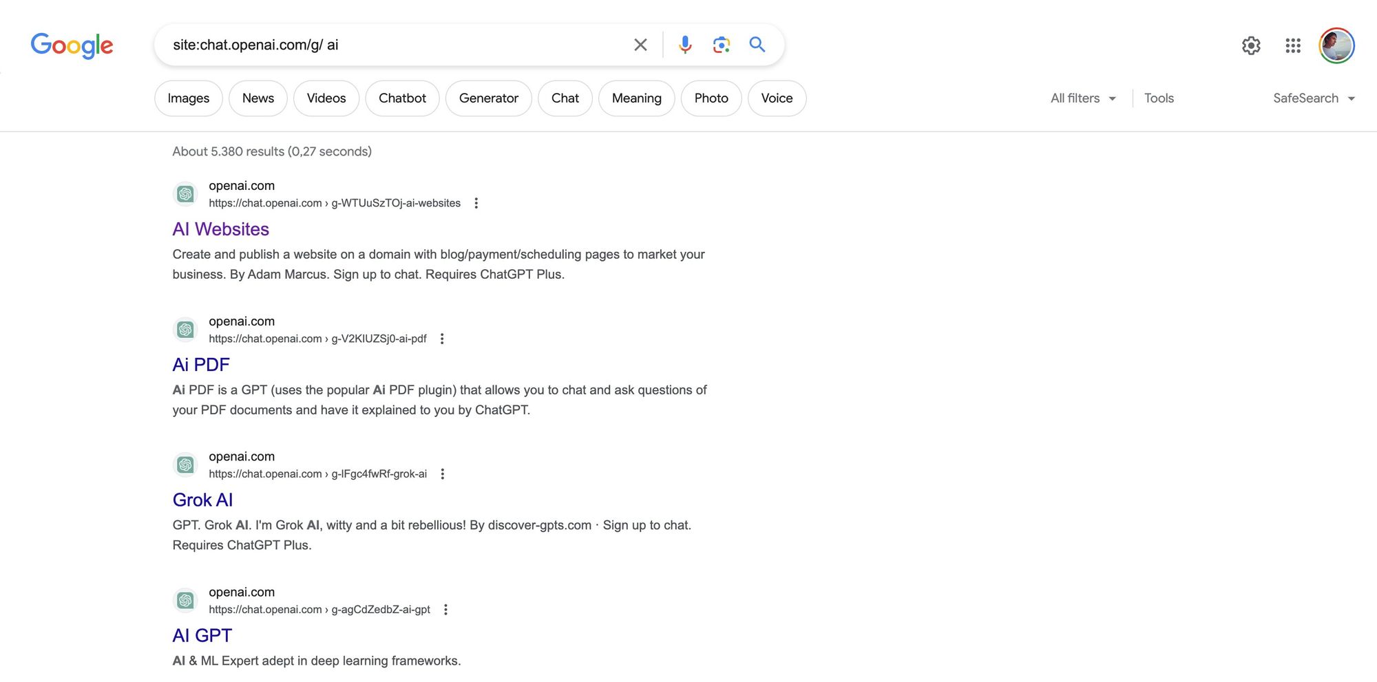 For those eager to unearth custom GPTs, you might have tried the Google search strategy using “site:chat.openai.com/g/ [search query]” to reveal some of the GPTs that have been indexed. This can be a useful starting point but is somewhat circumvented by the limitations of Google's indexing capabilities and other unpredictable variables.