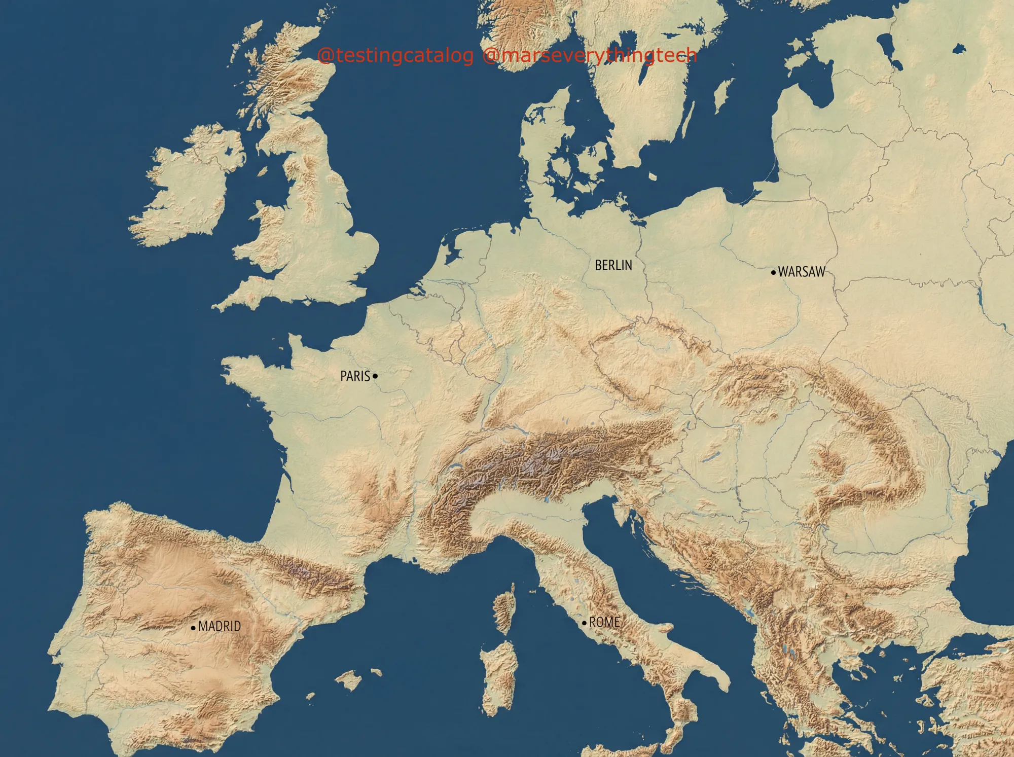 Prompt 1: A professional studio product shot of a futuristic, transparent smart-watch resting on a piece of dark slate. The watch interface is glowing holographic green. Soft dramatic lighting, 8k resolution, macro photography style, shallow depth of field. —ar 4:3 Prompt 2: A sophisticated, minimalist logo centered on a white background. The word "FRESH" is spelled out using realistic, glistening slices of kiwi and strawberry. High contrast, sharp focus, professional food photography style. —ar 1:1 Prompt 3: A vintage travel poster for "MARS COLONY." The main visual is a retro-futuristic biodome on a red landscape. Large, bold Art Deco typography at the top says "VISIT MARS," and smaller text at the bottom says "The Red Planet Awaits You - Est. 2050." Texture of worn paper. —ar 2:3 Prompt 4: A high-resolution, professional infographic map of Europe. The map should be topographical, showing mountain ranges in relief. Clear, sharp text labels should identify major capitals: "Paris", "Berlin", "Rome", "Madrid", and "Warsaw". The ocean should be a deep matte blue, and the land should be in natural earth tones. Clean, modern typography suitable for a textbook. —ar 4:3 Credits @MarsEverythingTech