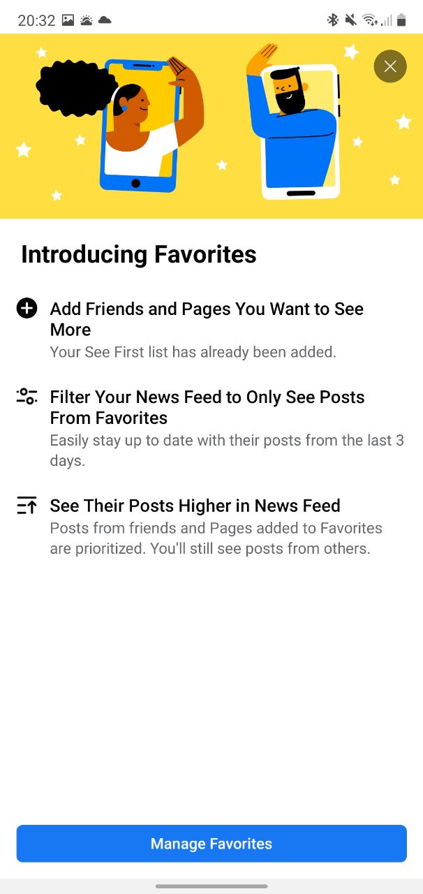 - The favourites tab allows you to select people and pages you want to read about first.