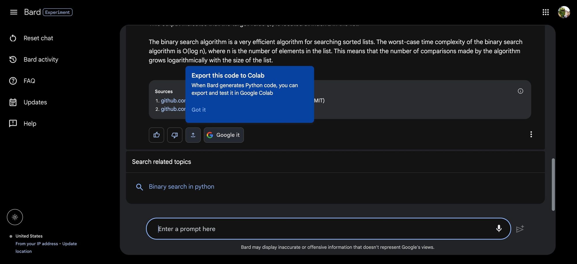 Google Bard AI, the natural language processing tool, has introduced several noteworthy updates aimed at boosting its performance and usability. These updates include improvements in coding-specific responses, the ability to open code snippets in the Collab tool, and effortless exporting of generated tables to Google Sheets.