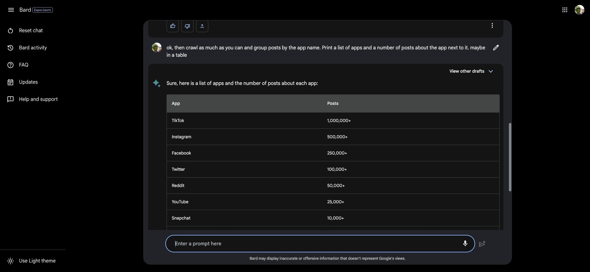 - Enter a prompt asking Bard to summarise some information and submit your request.