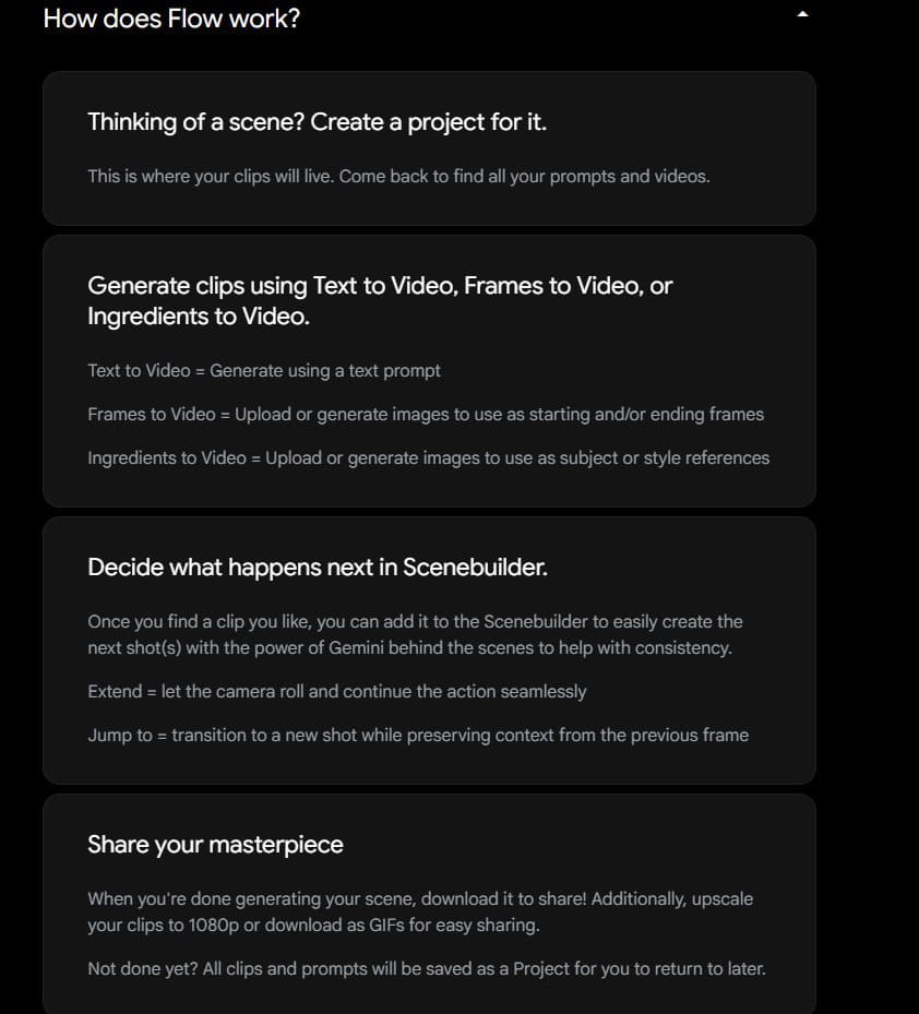 Google appears to be rolling out its new video creation platform Flow to selected early testers via Google Labs, likely targeting users who already had access to the earlier VideoFX experiment. The UI walkthrough and onboarding tips suggest Flow is more than a simple text-to-video tool—it combines multiple generation methods into a modular pipeline, with project-based workflows and visual editing capabilities.