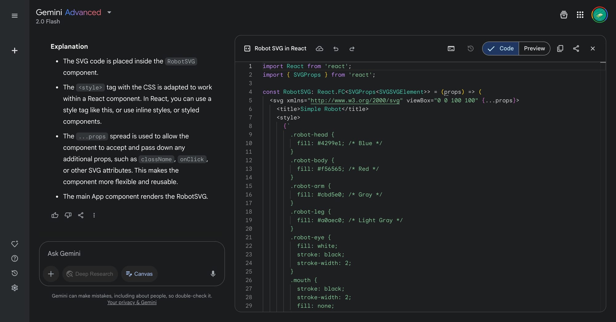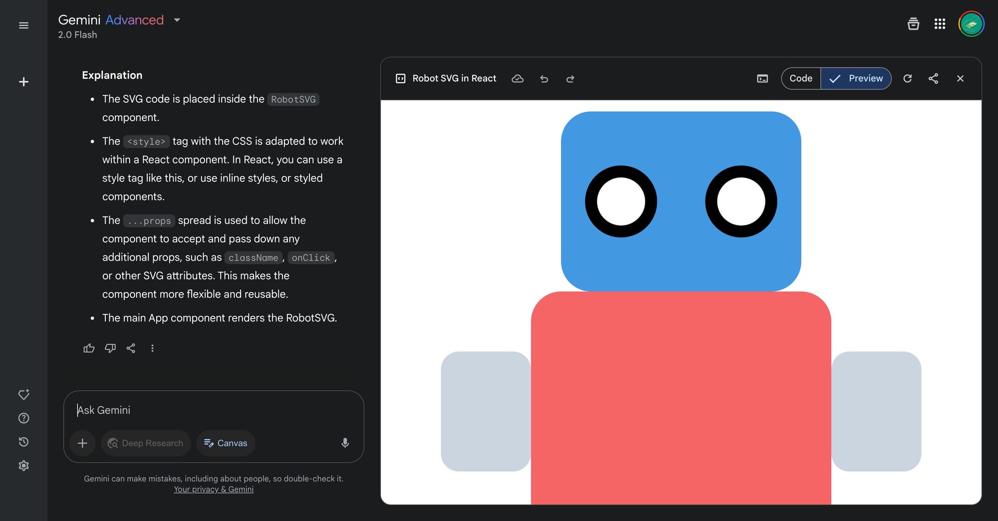 Canvas is an interactive workspace designed to facilitate real-time collaboration and content refinement. Users can generate high-quality drafts, edit documents, or code directly within the platform. The tool allows for seamless adjustments in tone, length, or formatting by simply highlighting sections and requesting changes. For example, users can ask Gemini to make a paragraph more concise or informal. It also supports exporting content to Google Docs for broader collaboration. Developers can use Canvas to transform ideas into working prototypes, preview HTML/React code designs, and iterate on projects such as web apps or Python scripts without switching applications.
