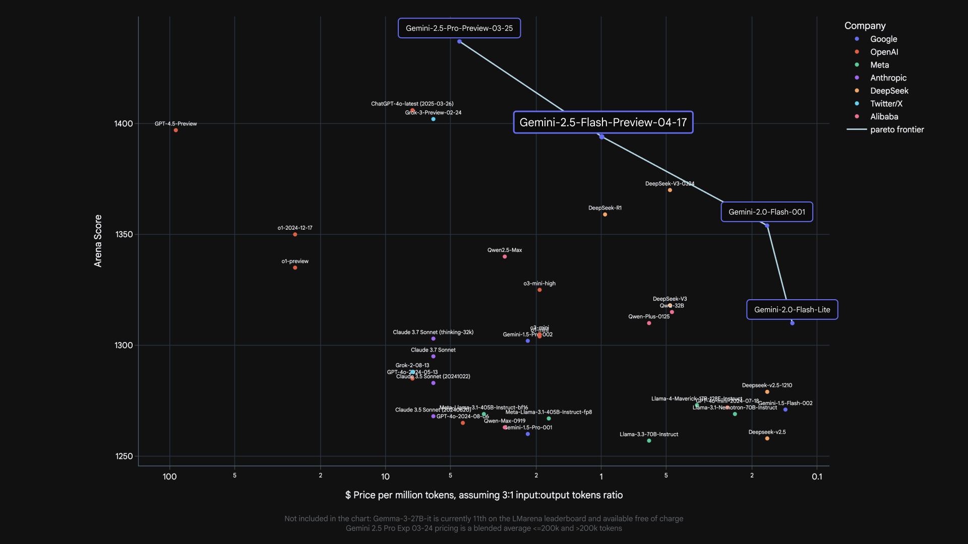 It is multimodal, supports a one-million-token context, and lets builders set a thinking_budget from 0-24,576 tokens. With reasoning enabled, it ranks just behind 2.5 Pro on the Hard Prompts benchmark. Input tokens cost $0.15 per million, while output costs scale from $0.60 (reasoning off) to $3.50 (reasoning on), providing a clear price-latency trade-off knob.