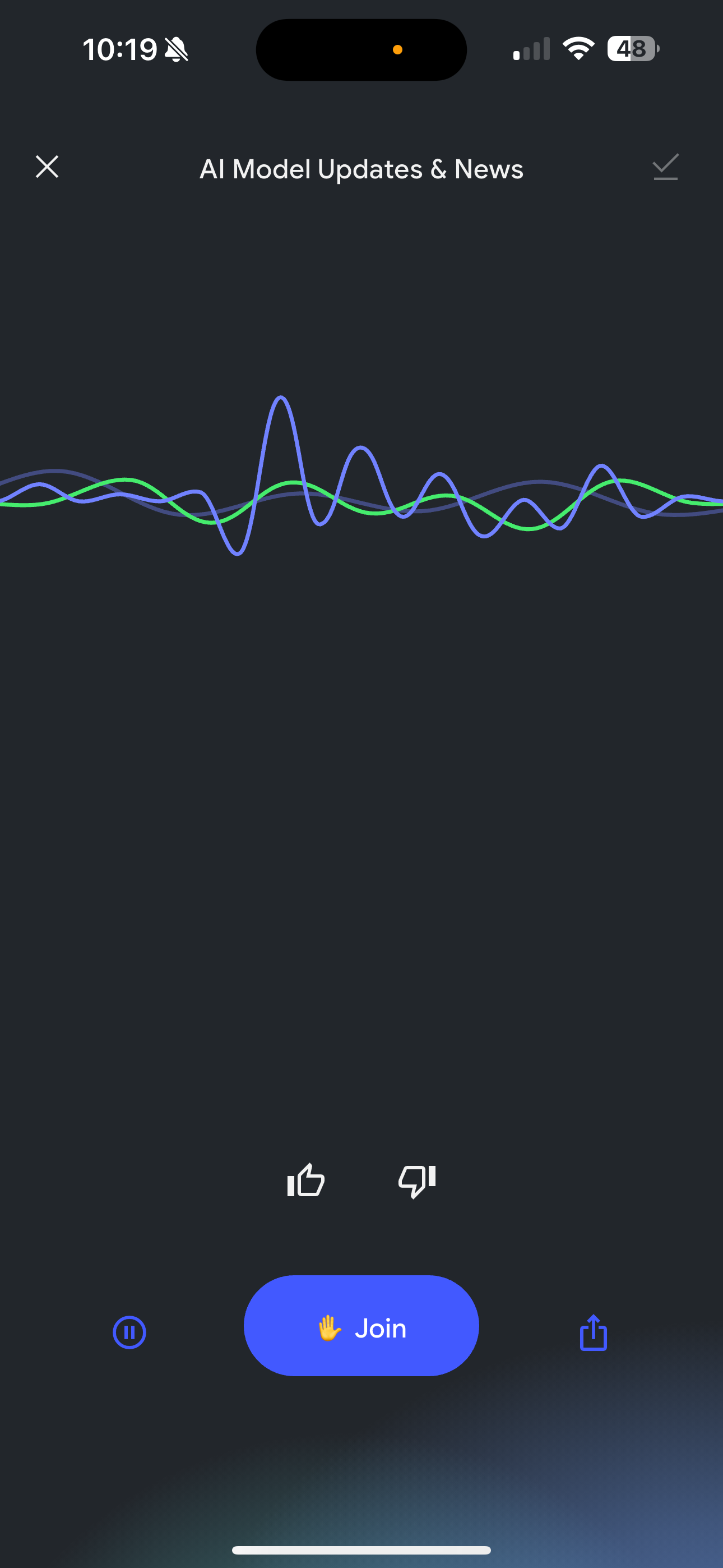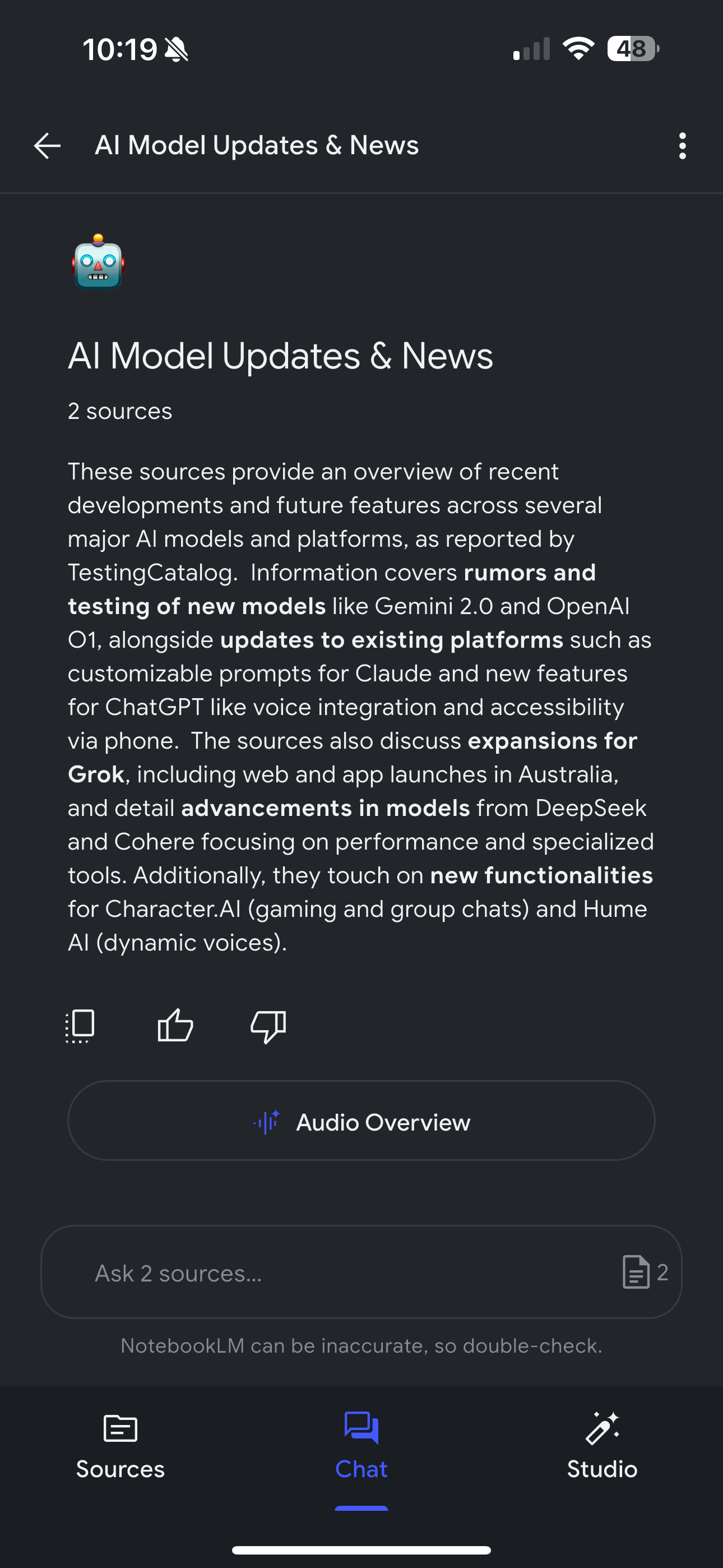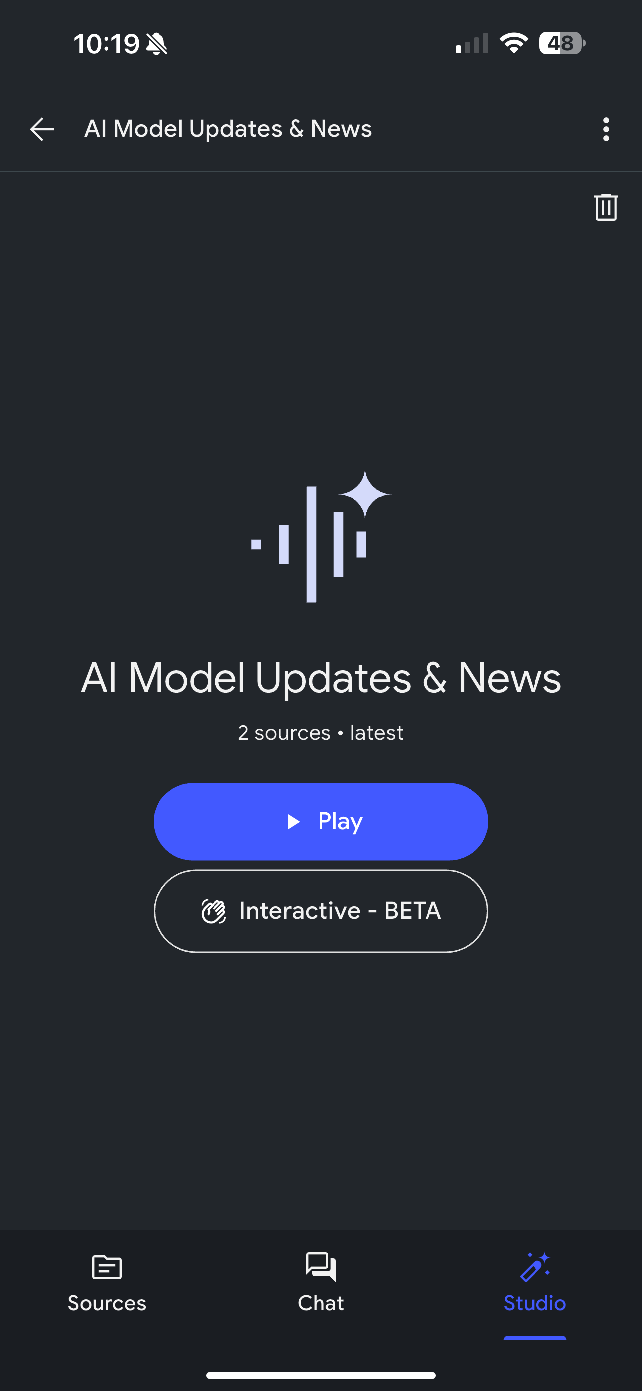 The interface inside a project closely reflects the web layout, splitting functionality across Sources, Chat, and Interactive Assets, including Notes, Audio Overviews, and Mind Maps. The app also supports Interactive Mode in audio sessions, where users can raise hands to ask questions mid-playback, introducing an element of live dialogue.