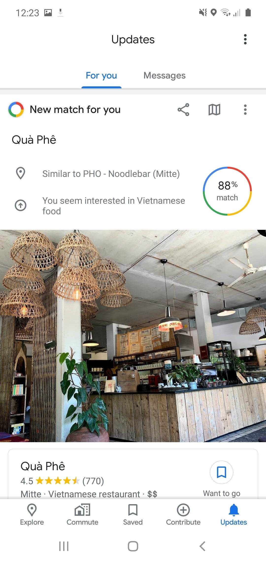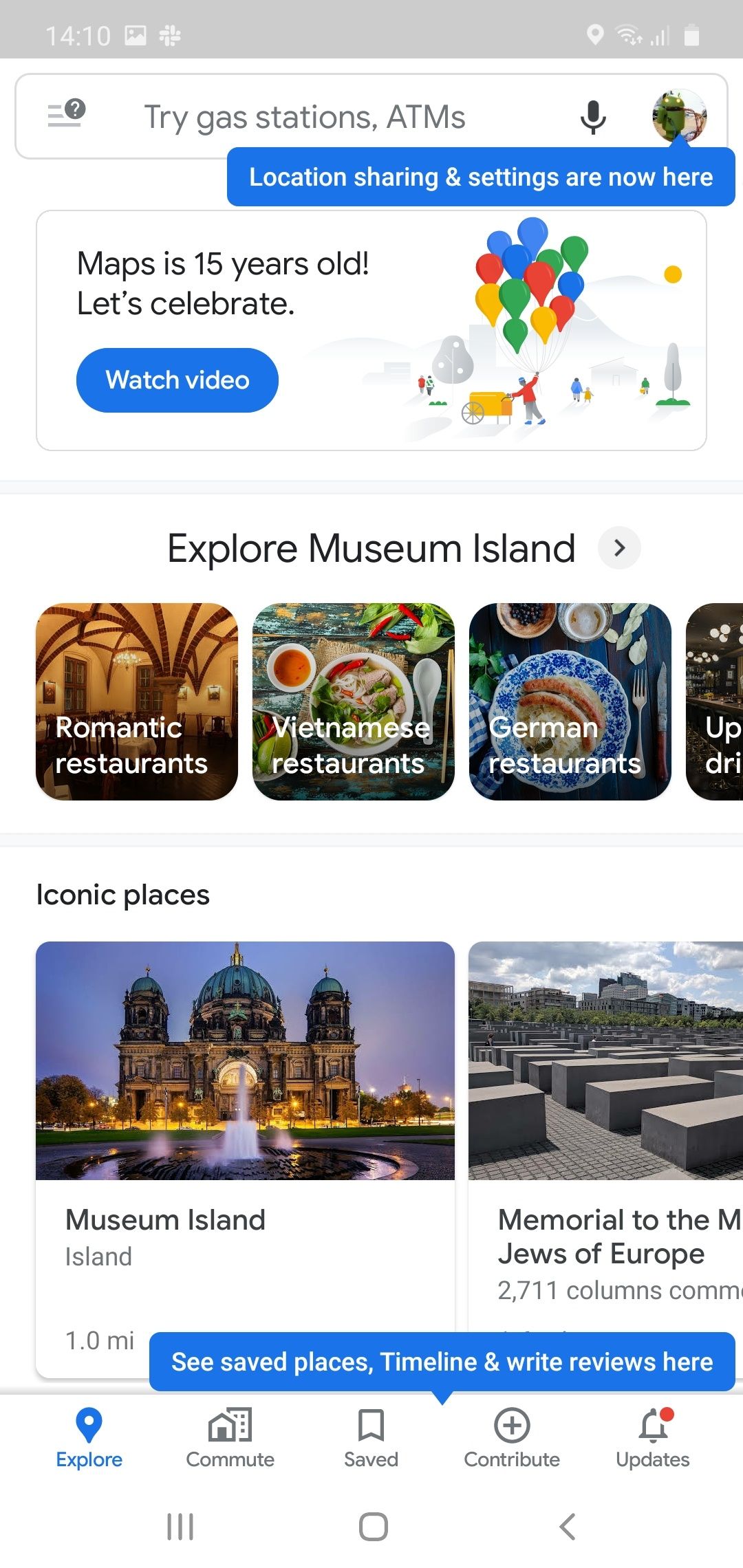 Further changes have been made to the bottom tab bar, which now houses exactly five options - three in my instance, I guess, because of where I live. To briefly list them all: Explore, Commute, Saved, Contribute, and Updates. The especially new one here is the latter, which serves users with currently trending places and other contributed recommendations.