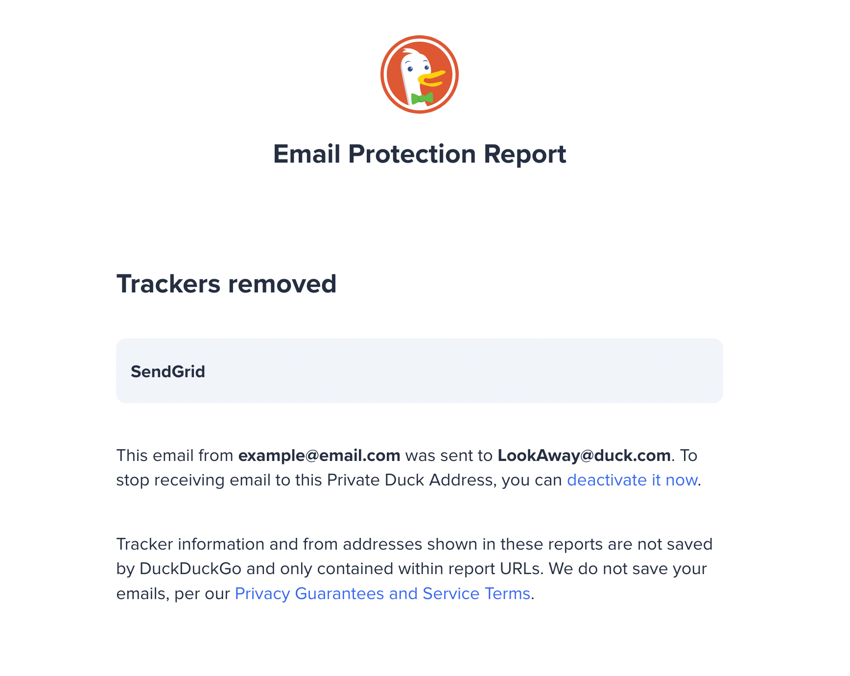 If you decide to click on the banner you get redirected to a website shown in the picture below. DuckDuckGo gave me all of the important information about the trackers removed and the option to stop receiving emails to my private Duck Address.