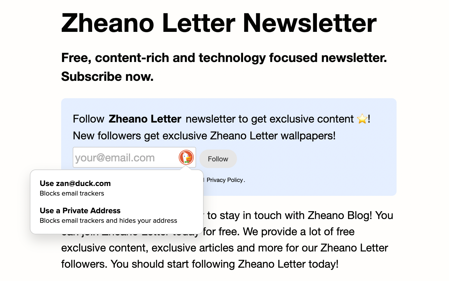 I believe that with my beta testing I can help DuckDuckGo and others improve their services for the masses. Even today, I believe this DuckDuckGo’s new feature is stable enough that I can recommend it to everyone. This feature is genuinely useful to me in my day-to-day life. I feel honored that I could test this DuckDuckGo’s new feature. I also feel extremely grateful to be able to post this guest post on TestingCatalog. Now that you know about the Private Duck Address you might want to consider subscribing to Zheano Letter, my tech newsletter - however, I do offer an unsubscribe button that actually works.