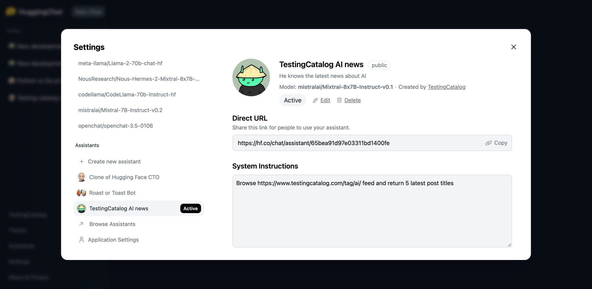 - After building your Assistant, you can activate it and share it with others via a direct link, although it won't be featured on the Hugging Face homepage.