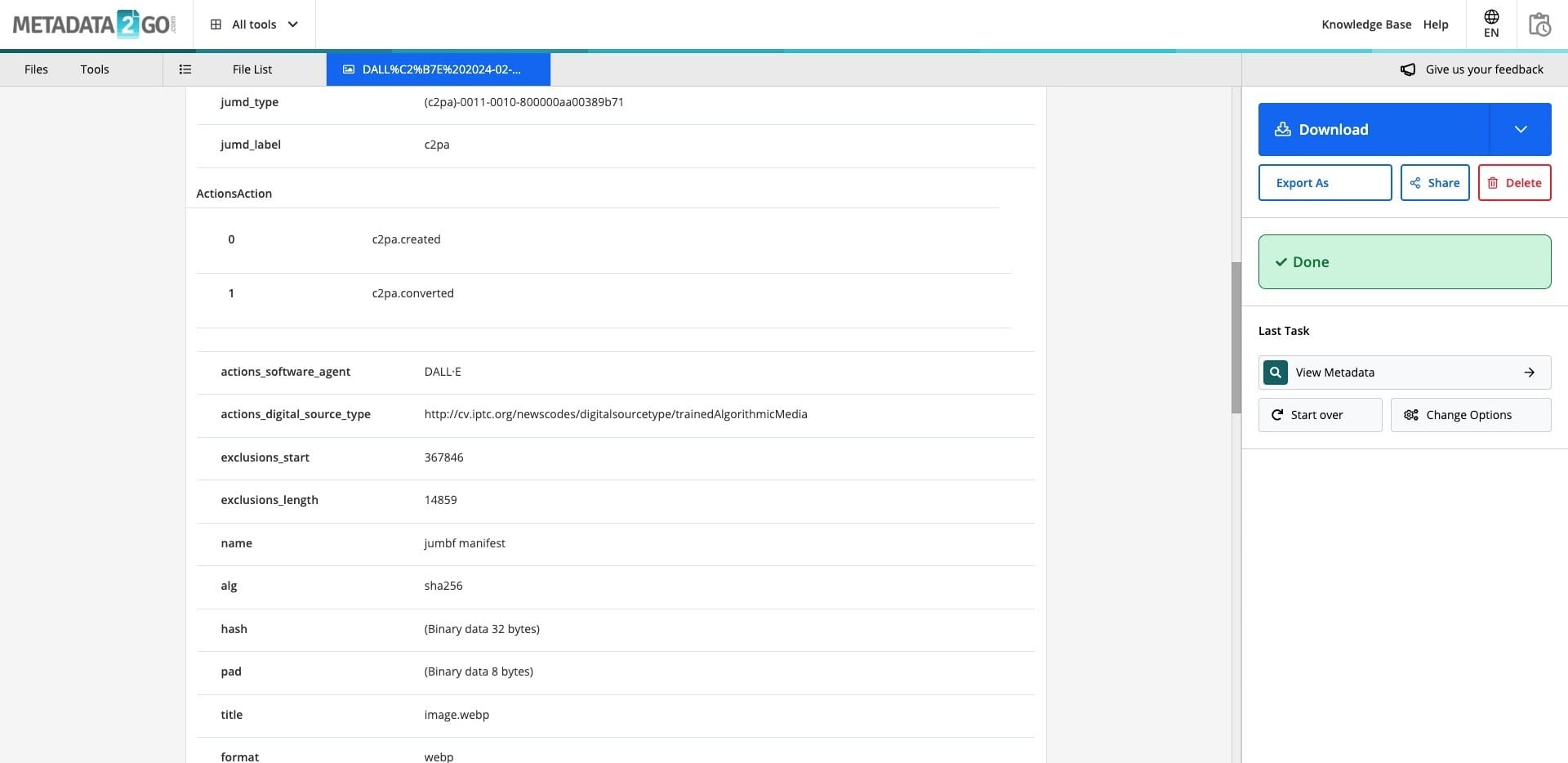 - When using DALL-E, the newly generated images will automatically contain the C2PA metadata. Be aware that this metadata is what platforms will use to label the content as "AI-generated".