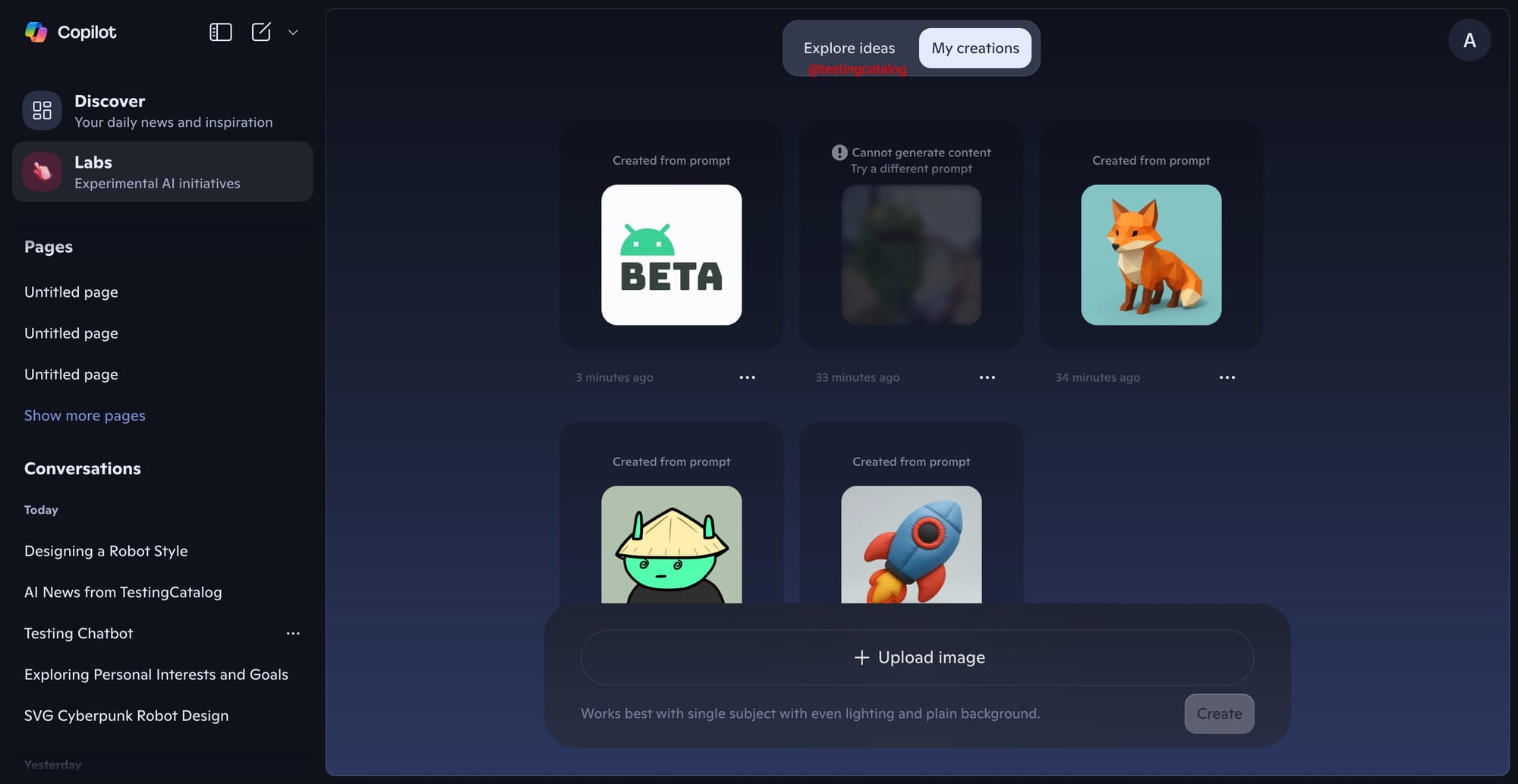 Microsoft keep working on the Copilot 3D experiment. Now it is possible to generate a 3d object from an image, as well as to browse the "My Creations" tab.