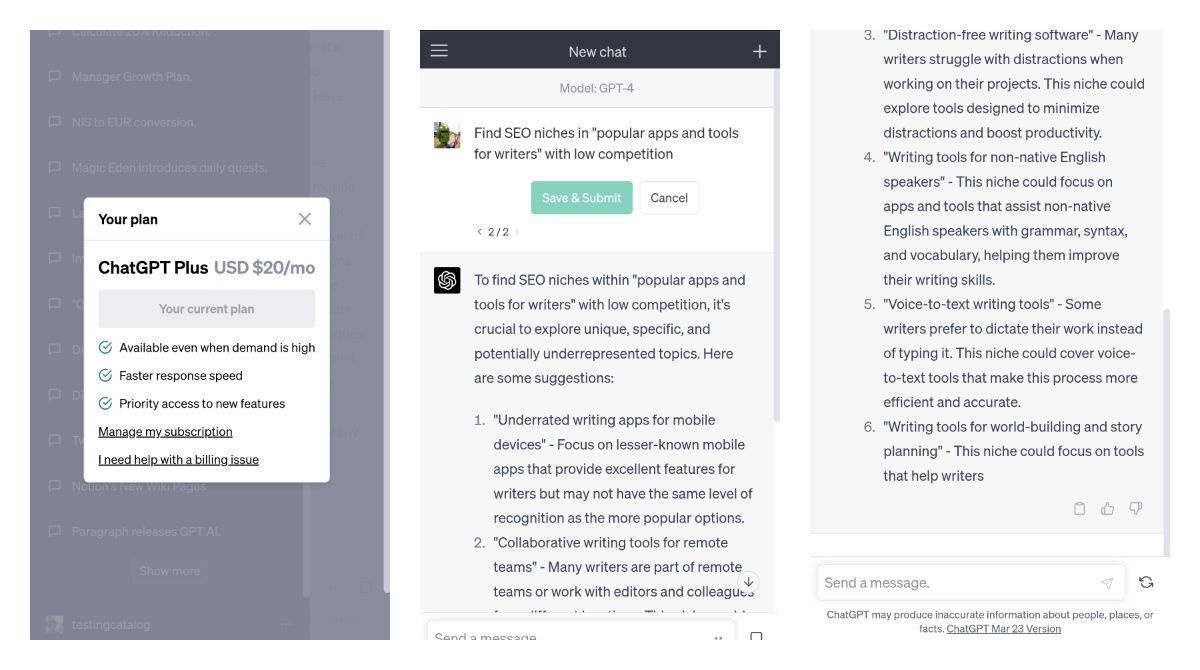 - Early access to new features: ChatGPT Plus now explicitly states that subscribers will have early access to upcoming features, making it even more appealing for professional writers and content creators.