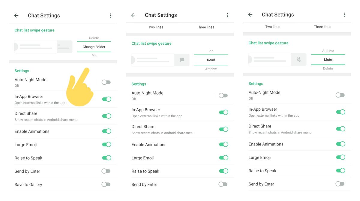 A new chat list swipe gesture setting is now also available, it allows you to change the behaviour when you swipe left and right on your list of chats. Changing folder comes as a default but can be changed to Archive, Read, Pin, Delete, and more. This option can be found in Chat Settings.