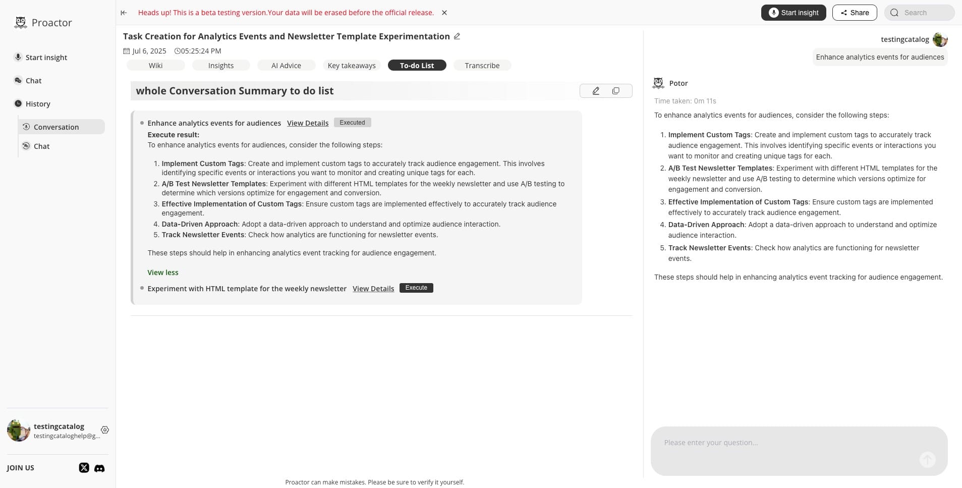 Proactor is positioning itself as a tool for professionals, managers, and teams who handle frequent meetings and want a more structured approach to capturing and using the knowledge generated in those interactions. Unlike traditional meeting assistants that focus mainly on transcription or passive note-taking, Proactor actively generates context-aware suggestions, called "AI Advice", creates actionable to-do lists, and builds a persistent wiki-style knowledge base from every conversation.