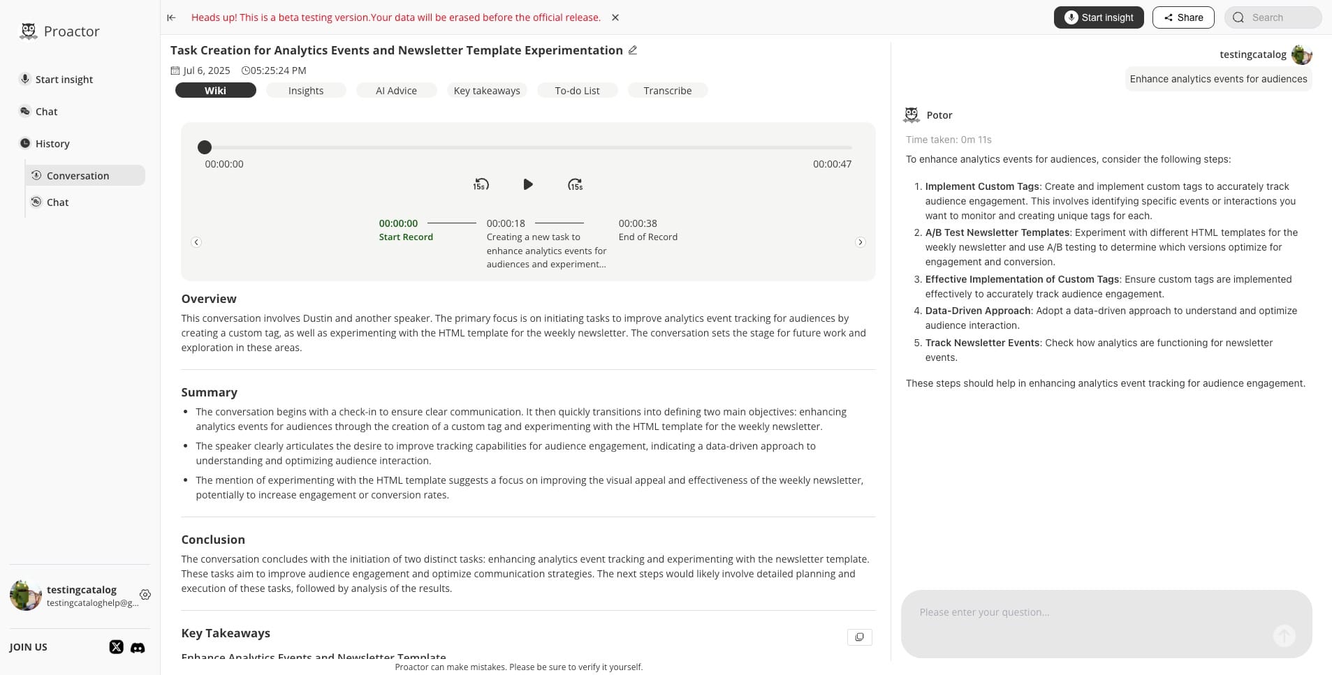 Proactor is positioning itself as a tool for professionals, managers, and teams who handle frequent meetings and want a more structured approach to capturing and using the knowledge generated in those interactions. Unlike traditional meeting assistants that focus mainly on transcription or passive note-taking, Proactor actively generates context-aware suggestions, called "AI Advice", creates actionable to-do lists, and builds a persistent wiki-style knowledge base from every conversation.