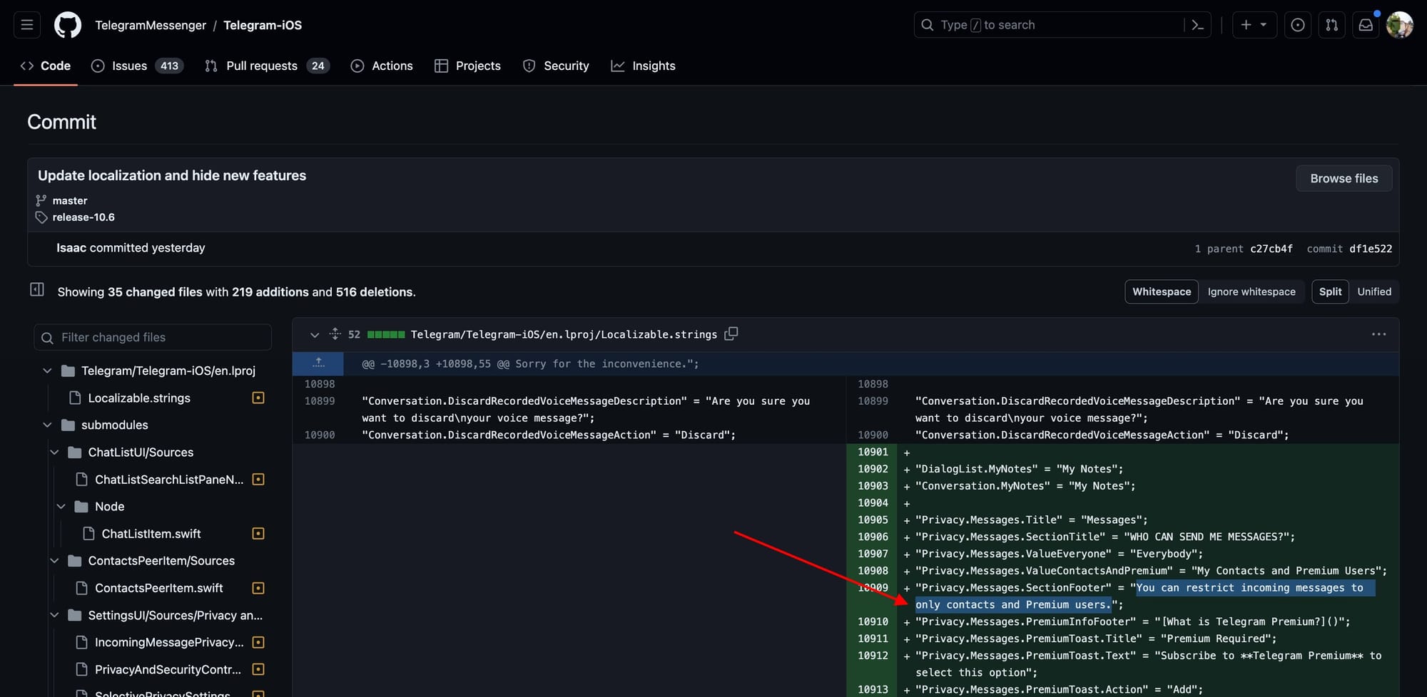 Interestingly, a peek into the source code for Telegram's iOS client revealed that developers might be working on a feature that restricts contact possibilities exclusively to premium users. However, this feature is currently under development, and its release date or eventual implementation remains uncertain.