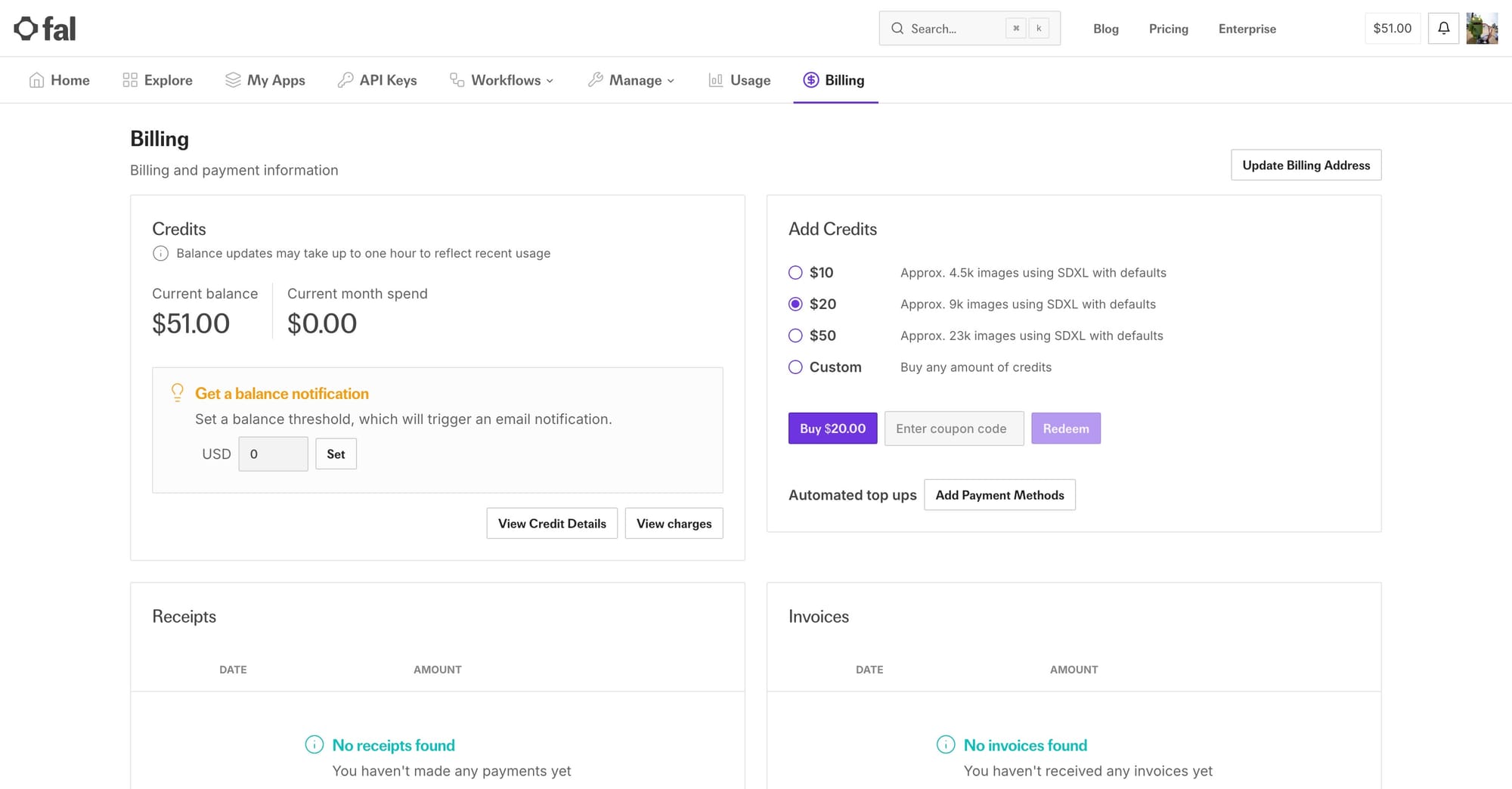 - Redeem your grant: Go to the billing tab on FAL and redeem the code